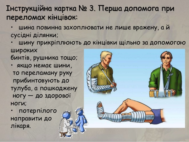 3. Що потрібно зробити для зменшення болю у постраждалого при переломі кінцівки?